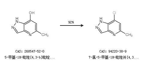 1.通过5-甲基-1H-吡唑[4,3-b]吡啶-7-醇合成7-氯-5-甲基-1H-吡唑并[4,3-b]-吡啶,收率约92%;