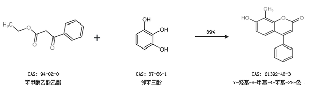 2.通过苯甲酰乙酸乙酯和邻苯三酚合成7-羟基-8-甲基-4-苯基-2H-色烯-2-酮,收率约89%;