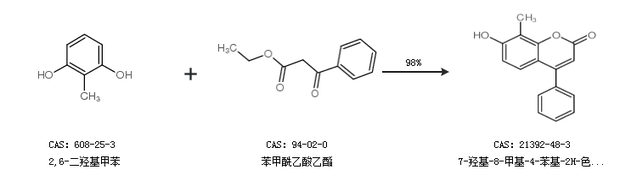 1.通过2,6-二羟基甲苯和苯甲酰乙酸乙酯合成7-羟基-8-甲基-4-苯基-2H-色烯-2-酮,收率约98%;