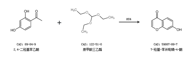 1.通过2,4-二羟基苯乙酮和原甲酸三乙酯合成7-羟基-苯并吡喃-4-酮,收率约85%;