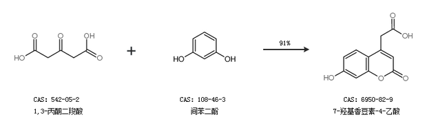 2.通过1,3-丙酮二羧酸和间苯二酚合成7-羟基香豆素-4-乙酸,收率约91%;