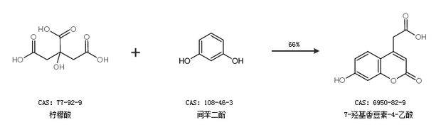 1.通过柠檬酸和间苯二酚合成7-羟基香豆素-4-乙酸,收率约66%;