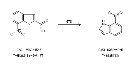 1.通过7-硝基吲哚-2-甲酸合成7-硝基吲哚,收率约67%;