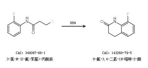 1.通过3-氯-N-(2-氟-苯基)-丙酰胺合成8-氟-3,4-二氢-1H-喹啉-2-酮,收率约88%;