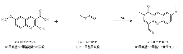1.通过6-甲氧基-2-甲基喹啉-3-羧酸和N,N-二甲基甲酰胺合成8-甲氧基-2-甲基-1-氧代-1,2-二氢苯并[b]-1,6-萘啶-4-甲醛,收率约55%;