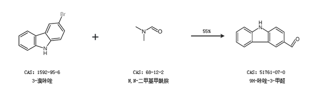2.通过3-溴咔唑和N,N-二甲基甲酰胺合成9H-咔唑-3-甲醛,收率约55%;