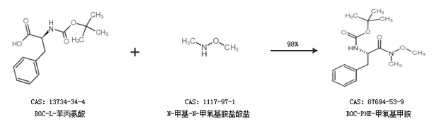 1.通过BOC-L-苯丙氨酸和N-甲基-N-甲氧基胺盐酸盐合成BOC-PHE-甲氧基甲胺,收率约98%;