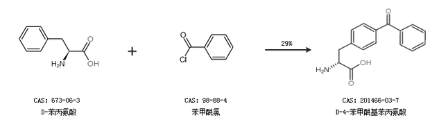 1.通过D-苯丙氨酸和苯甲酰氯合成D-4-苯甲酰基苯丙氨酸,收率约29%;