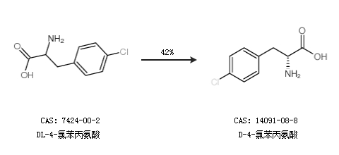 2.通过DL-4-氯苯丙氨酸合成D-4-氯苯丙氨酸,收率约42%;