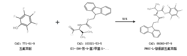 2.通过五氟苯酚和(S)-(9H-芴-9-基)甲基(1-氯-3-甲基-1-氧代-2-丁基)氨基甲酸酯合成FMOC-L-缬氨酸五氟苯酯,收率约91%;