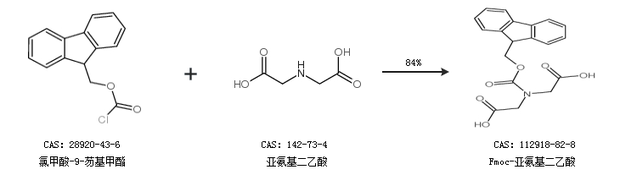 1.通过氯甲酸-9-芴基甲酯和亚氨基二乙酸合成Fmoc-亚氨基二乙酸,收率约84%;