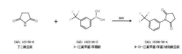 1.通过丁二酰亚胺和3-(三氟甲基)苯硼酸合成N-(3-(三氟甲基)苯基)琥珀酰亚胺,收率约66%;