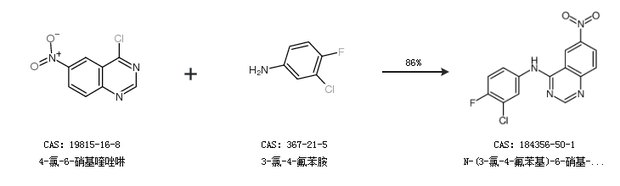 2.通过4-氯-6-硝基喹唑啉和3-氯-4-氟苯胺合成N-(3-氯-4-氟苯基)-6-硝基-4-喹唑啉胺,收率约86%;