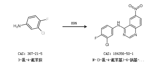 1.通过3-氯-4-氟苯胺合成N-(3-氯-4-氟苯基)-6-硝基-4-喹唑啉胺,收率约89%;