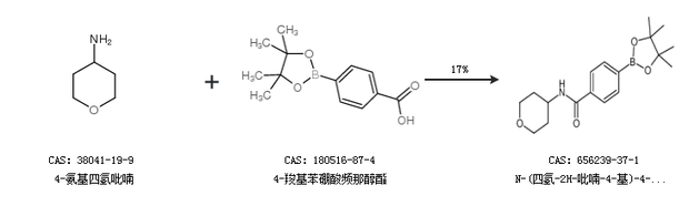 1.通过4-氨基四氢吡喃和4-羧基苯硼酸频那醇酯合成N-(四氢-2H-吡喃-4-基)-4-(4,4,5,5-四甲基-1,3,2-二噁硼烷-2-基)苯甲酰胺,收率约17%;