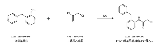 1.通过邻苄基苯胺和一氯代乙酰氯合成N-[2-(苯基甲基)苯基]-2-氯乙酰胺,收率约76%;