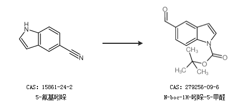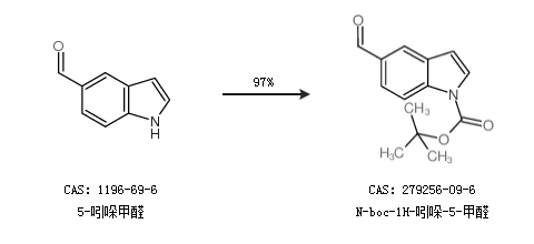 1.通过5-吲哚甲醛合成N-boc-1H-吲哚-5-甲醛,收率约97%;