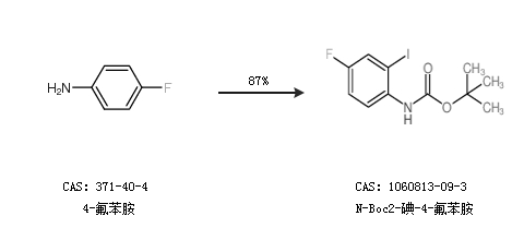 1.通过4-氟苯胺合成N-Boc2-碘-4-氟苯胺,收率约87%;