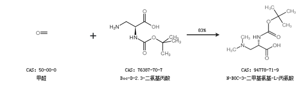 1.通过甲醛和Boc-D-2.3-二氨基丙酸合成N-BOC-3-二甲基氨基-L-丙氨酸,收率约83%;
