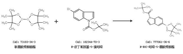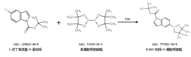 1.通过1-叔丁氧羰基-5-氯吲哚和联硼酸频那醇酯合成N-BOC-吲哚-5-硼酸频那酯,收率约73%;