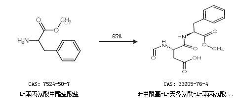 1.通过L-苯丙氨酸甲酯盐酸盐合成N-甲酰基-L-天冬氨酰-L-苯丙氨酸甲酯,收率约65%;