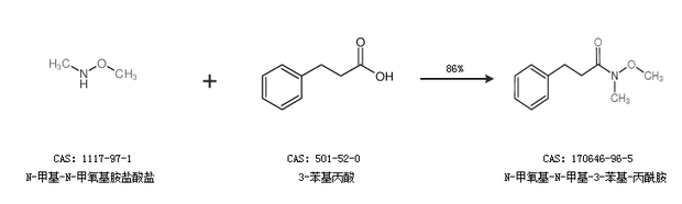 2.通过N-甲基-N-甲氧基胺盐酸盐和3-苯基丙酸合成N-甲氧基-N-甲基-3-苯基-丙酰胺,收率约86%;