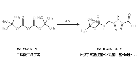 1.通过二碳酸二叔丁酯合成N-叔丁氧基羰基-2-氨基甲基-咪唑-4-羧酸,收率约93%;