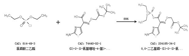 1.通过氯磷酸二乙酯和(Z)-2-(2-氨基噻唑-4-基)-2-叔丁氧羰甲氧亚氨基乙酸合成O,O-二乙基磷-(Z)-2-(2-氨基噻唑-4-基)-2-(T-丁氧基羰基甲氧基亚氨基)乙酸酯,收率约89%;