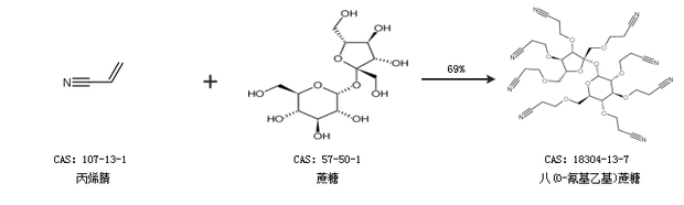 1.通过丙烯腈和蔗糖合成八(O-氰基乙基)蔗糖,收率约69%;