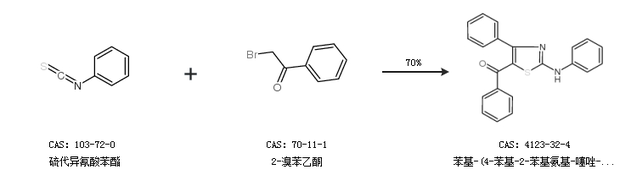 1.通过硫代异氰酸苯酯和2-溴苯乙酮合成苯基-(4-苯基-2-苯基氨基-噻唑-5-基)-甲酮,收率约70%;