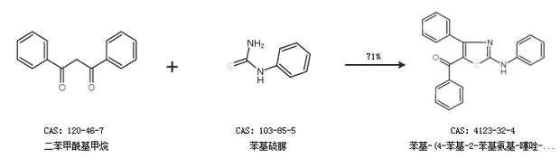 2.通过二苯甲酰基甲烷和苯基硫脲合成苯基-(4-苯基-2-苯基氨基-噻唑-5-基)-甲酮,收率约71%;