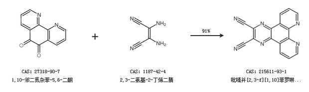 2.通过1,10-邻二氮杂菲-5,6-二酮和2,3-二氨基-2-丁烯二腈合成吡嗪并[2,3-f][1,10]菲罗啉-2,3-二甲腈,收率约91%;