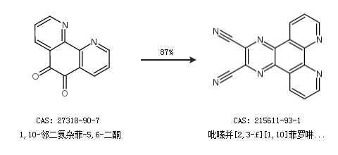1.通过1,10-邻二氮杂菲-5,6-二酮合成吡嗪并[2,3-f][1,10]菲罗啉-2,3-二甲腈,收率约87%;