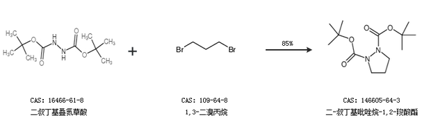 1.通过二叔丁基叠氮草酸和1,3-二溴丙烷合成二-叔丁基吡唑烷-1,2-羧酸酯,收率约85%;