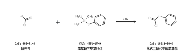 2.通过硫光气和苯基硫三甲基硅烷合成氯代二硫代甲酸苯基酯,收率约77%;