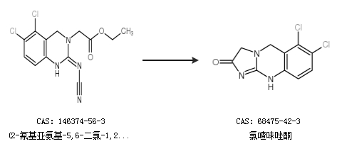 2.通过(2-氰基亚氨基-5,6-二氯-1,2,3,4-四氢喹唑啉-3-基)乙酸乙酯合成氯喳味唑酮