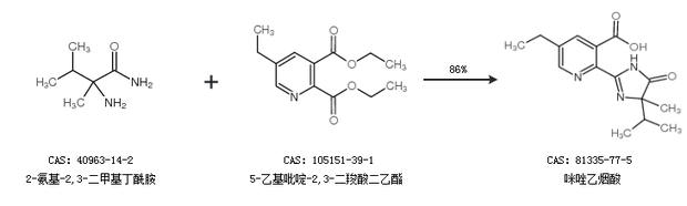 英文别名 5-Ethyl-2-(4-isopropyl-4-methyl-5-oxo-4,5-dihydro-1H-imidazol-2-yl)nicotinic acid;rac-5-ethyl-2-[(4R)-4-methyl-5-oxo-4-(propan-2-yl)-4,5-dihydro-1H-imidazol-2-yl]pyridine-3-carboxylic acid;5-ethyl-2-[(RS)-4-isopropyl-4-methyl-5-oxo-2-imidazolin-2-yl]nicotinic acid;2-[4,5-dihydro-4-methyl-4-(1-methylethyl)-5-oxo-1H-imidazol-2-yl]-5-ethyl-3-pyridinecarboxylic acid;5-ethyl-2-(4-methyl-5-oxo-4-propan-2-yl-1H-imidazol-2-yl)pyridine-3-carboxylic acid;