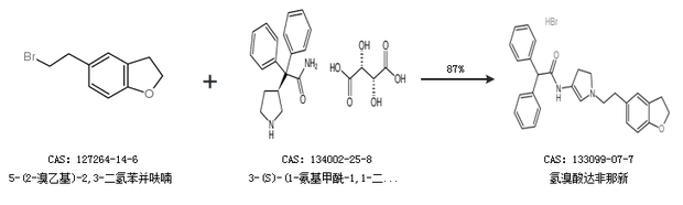 2.通过5-(2-溴乙基)-2,3-二氢苯并呋喃和3-(S)-(1-氨基甲酰-1,1-二苯基甲基)吡咯烷合成氢溴酸达非那新,收率约87%;