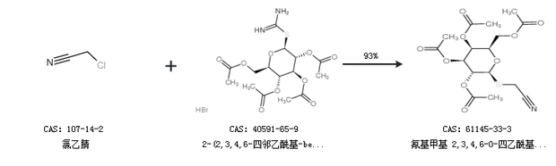 2.通过氯乙腈和2-(2,3,4,6-四邻乙酰基-beta-d-吡喃葡萄糖)-2-硫代异脲氢溴酸合成氰基甲基 2,3,4,6-O-四乙酰基-beta-D-硫代吡喃半乳糖苷,收率约93%;