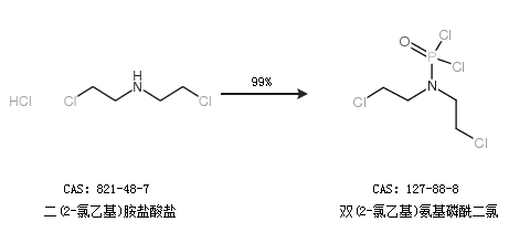 1.通过二(2-氯乙基)胺盐酸盐合成双(2-氯乙基)氨基磷酰二氯,收率约99%;
