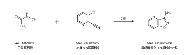 2.通过乙酰氧肟酸和3-氯-2-氰基吡啶合成异噁唑并[4,5-b]吡啶-3-胺,收率约24%;