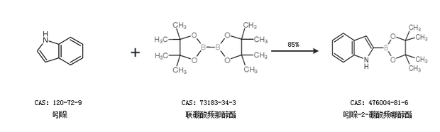 1.通过吲哚和联硼酸频那醇酯合成吲哚-2-硼酸频哪醇酯,收率约85%;
