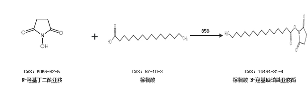 2.通过N-羟基丁二酰亚胺和棕榈酸合成棕榈酸 N-羟基琥珀酰亚胺酯,收率约85%;