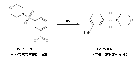 1.通过4-(3-硝基苯基磺酰)吗啉合成2‘-三氟甲基联苯-3-羧醛,收率约91%;