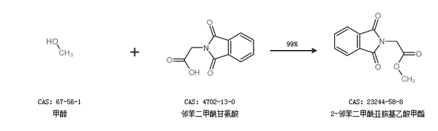1.通过甲醇和邻苯二甲酰甘氨酸合成2-邻苯二甲酰亚胺基乙酸甲酯,收率约99%;