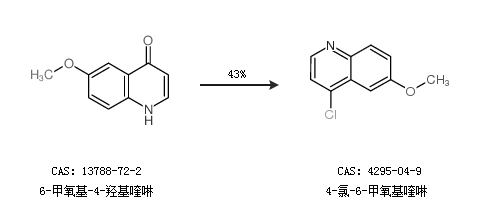 2.通过6-甲氧基-4-羟基喹啉合成4-氯-6-甲氧基喹啉,收率约43%;