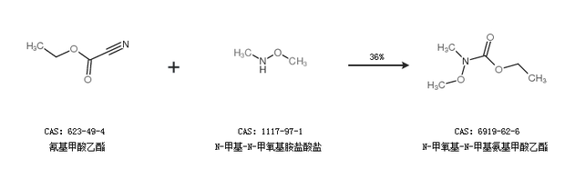 2.通过氰基甲酸乙酯和N-甲基-N-甲氧基胺盐酸盐合成N-甲氧基-N-甲基氨基甲酸乙酯,收率约36%;