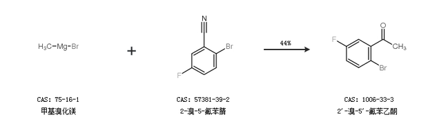 1.通过甲基溴化镁和2-溴-5-氟苯腈合成2''-溴-5''-氟苯乙酮,收率约44%;