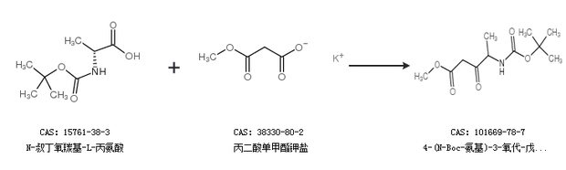 1.通过N-叔丁氧羰基-L-丙氨酸和丙二酸单甲酯钾盐合成4-(N-Boc-氨基)-3-氧代-戊酸甲酯
