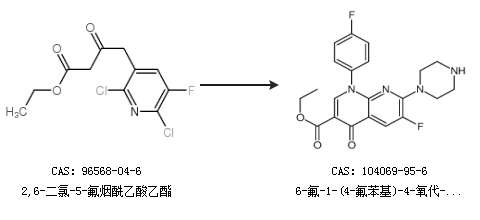 2.通过2,6-二氯-5-氟烟酰乙酸乙酯合成6-氟-1-(4-氟苯基)-4-氧代-7-(哌嗪-1-基)-1,4-二氢-1,8-萘啶-3-羧酸乙酯